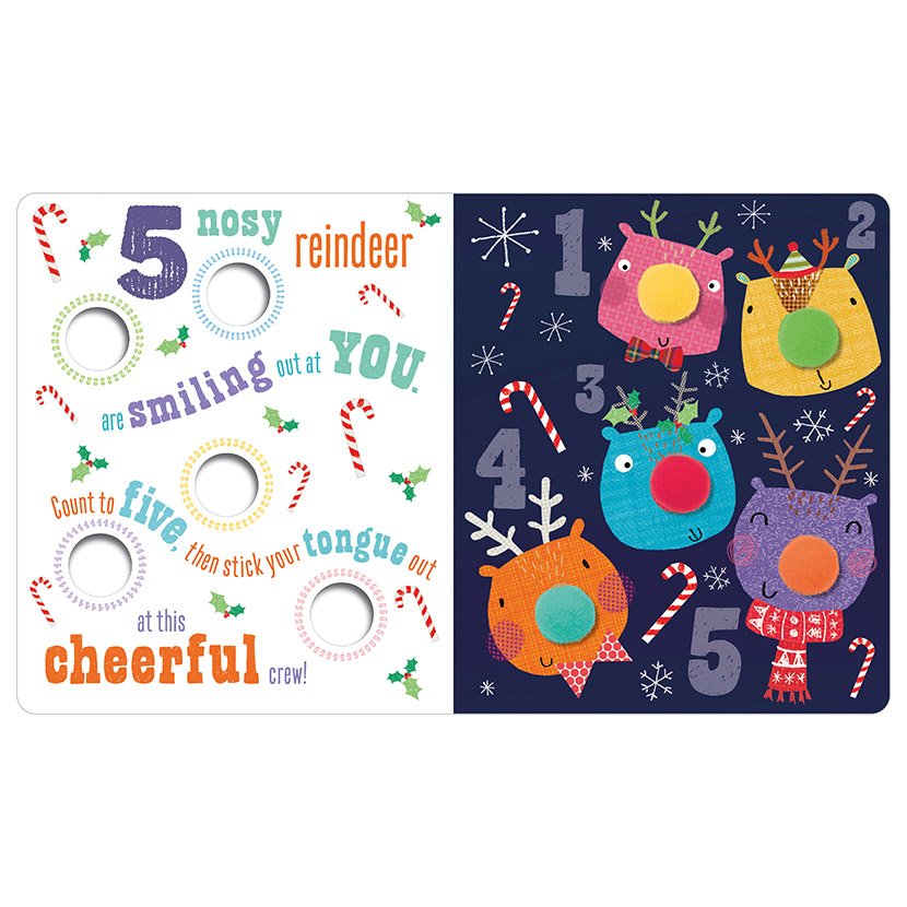 A tactile new novelty book with five fuzzy pom-poms cut all the way through the book from the back to the front cover. Inside, you will find various festive scenes with the pom-poms decorated as items to count! TOUCH THE FUZZY POM-POMS AS YOU COUNT TO FIVE TOGETHER