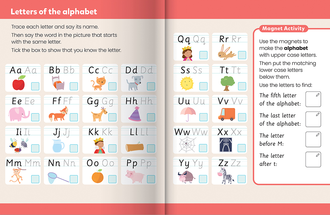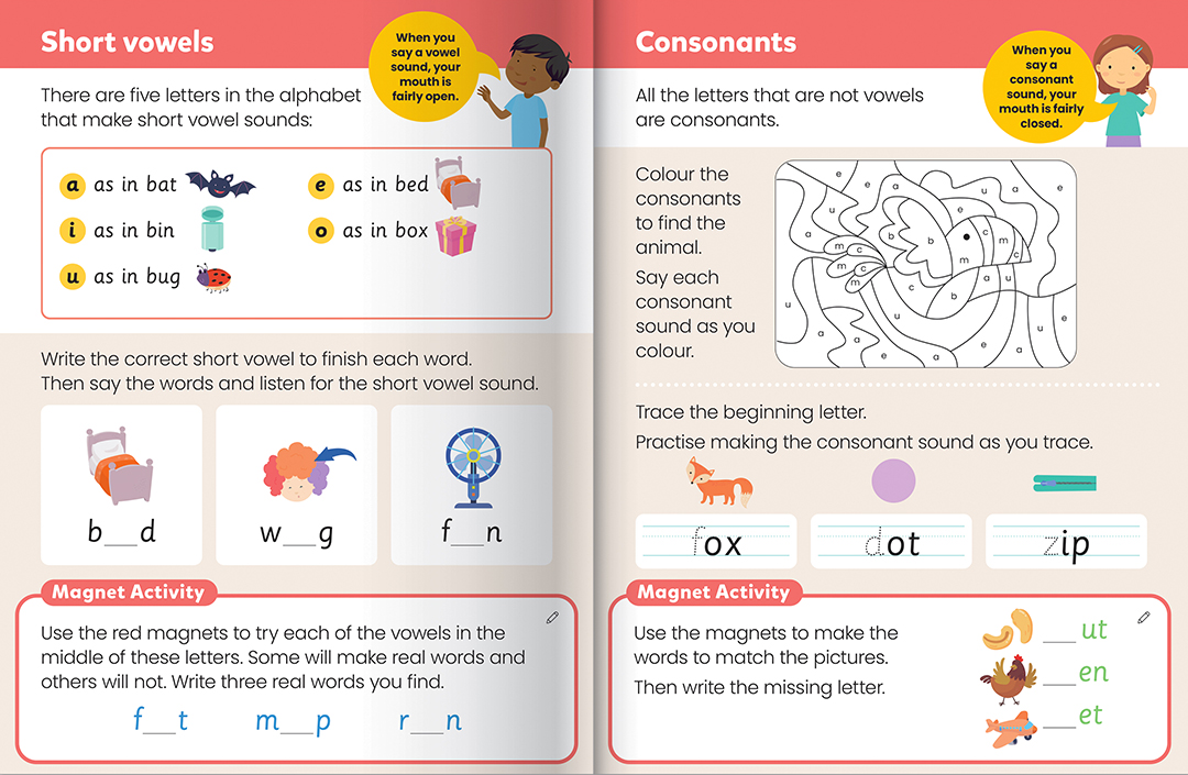 • 16-page activity book filled with key concepts such as alphabet knowledge, vowels and consonants, and word families.