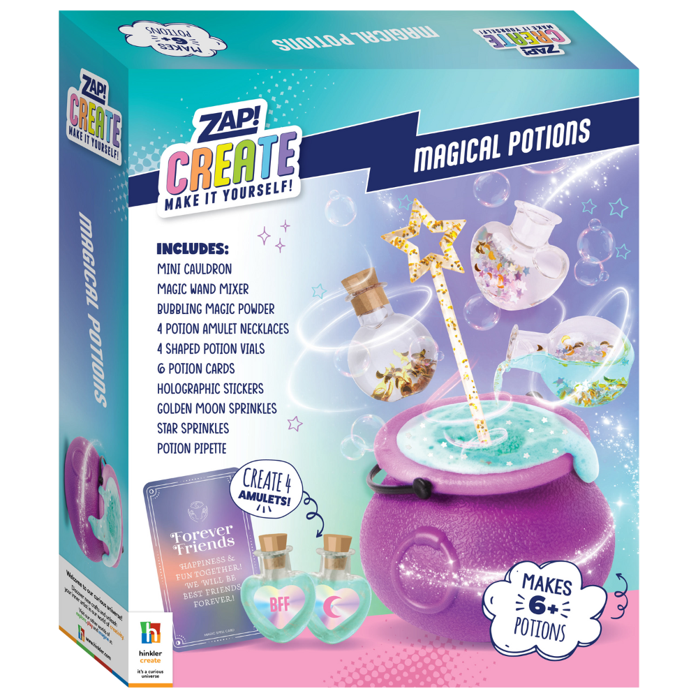 Magic awaits at your fingertips with our Zap Create Magic Potions Kit! The magic cards are packed with instructions and incantations for cool potions and charms that are just waiting for you to bring them to life. We?ve included all the tools a good potions maker needs to get started from a cauldron, ingredient vials and good-charm talisman to store your colourful, bubbling potions. Make magic today!